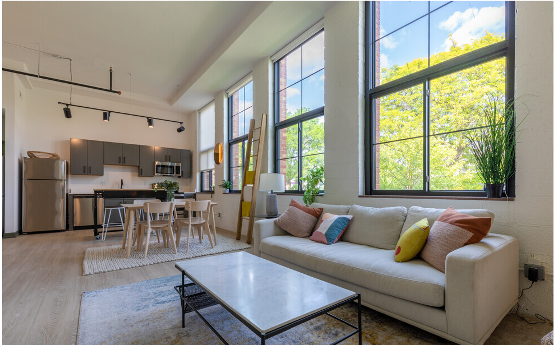 Ivy Lofts Spacious One-Bedroom with Zoom Room, 12' ceilings, 10' east facing windows, corner apartment, FREE parking, washer/dryer